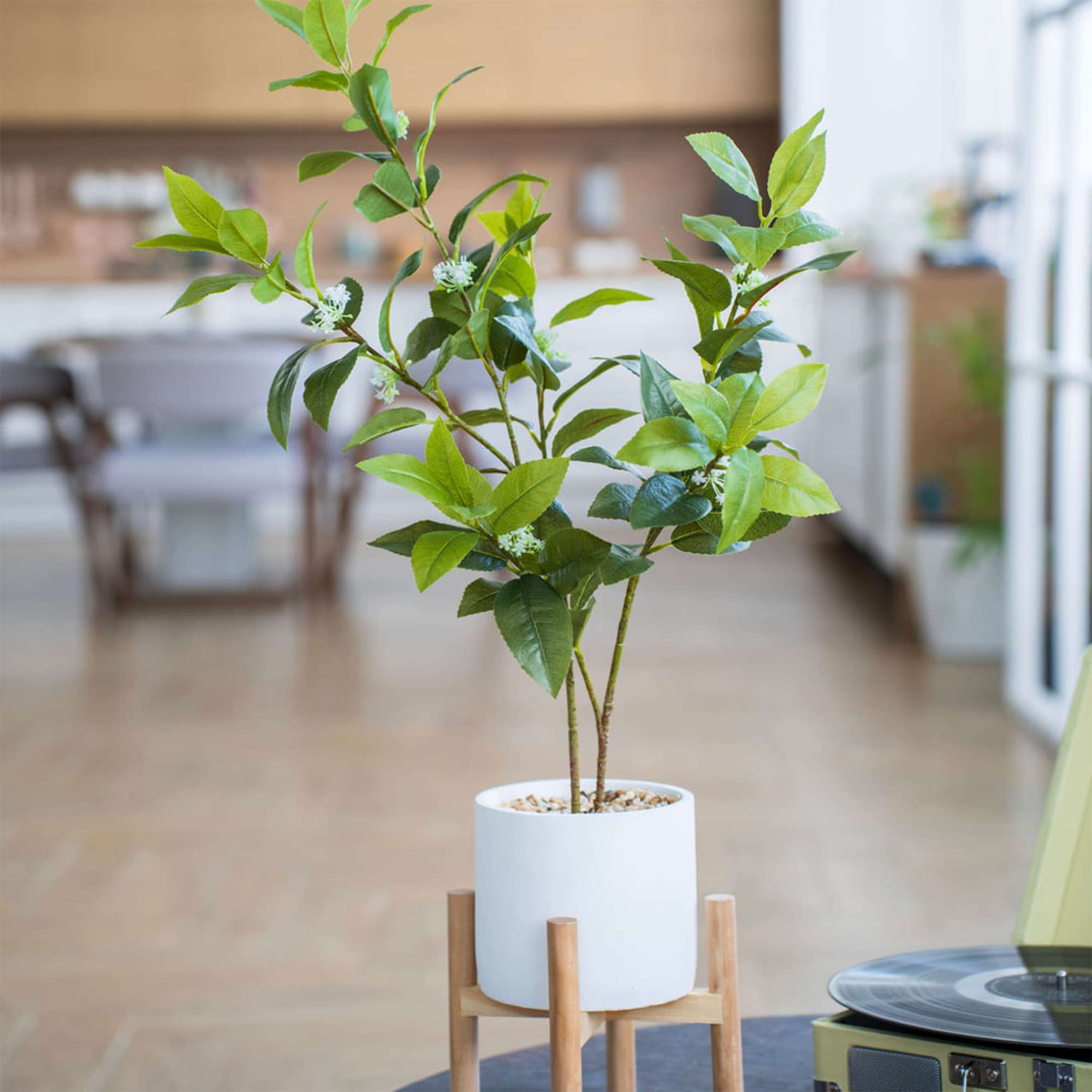 Декоративное дерево в цементном горшке с подставкой из МДФ. Высота цветка в горшке 71 см. Высота цветка на подставке 79 см. Почва внутри горшка изготовлена из пенопласта, ствол и ветви - из гибкого пластика с металлическим каркасом внутри, а листья - из клеенчатого ПВХ-материала, благодаря которому они максимально похожи на живые. Дерево в цементном горшке на деревянной подставке - это идеальный аксессуар для оживления пространства в домашнем или офисном интерьере: все элементы смотрятся абсолютно натурально и при этом цветок не требует полива или пересадки. Растение не осыпается, не оставляет пыльцу и не вызывает аллергических реакций. Для ухода достаточно протирать листья влажной губкой или салфеткой. Материал изготовления цветка: пластик, металл, цементный горшок, основа из пенопласта, деревянная подставка.