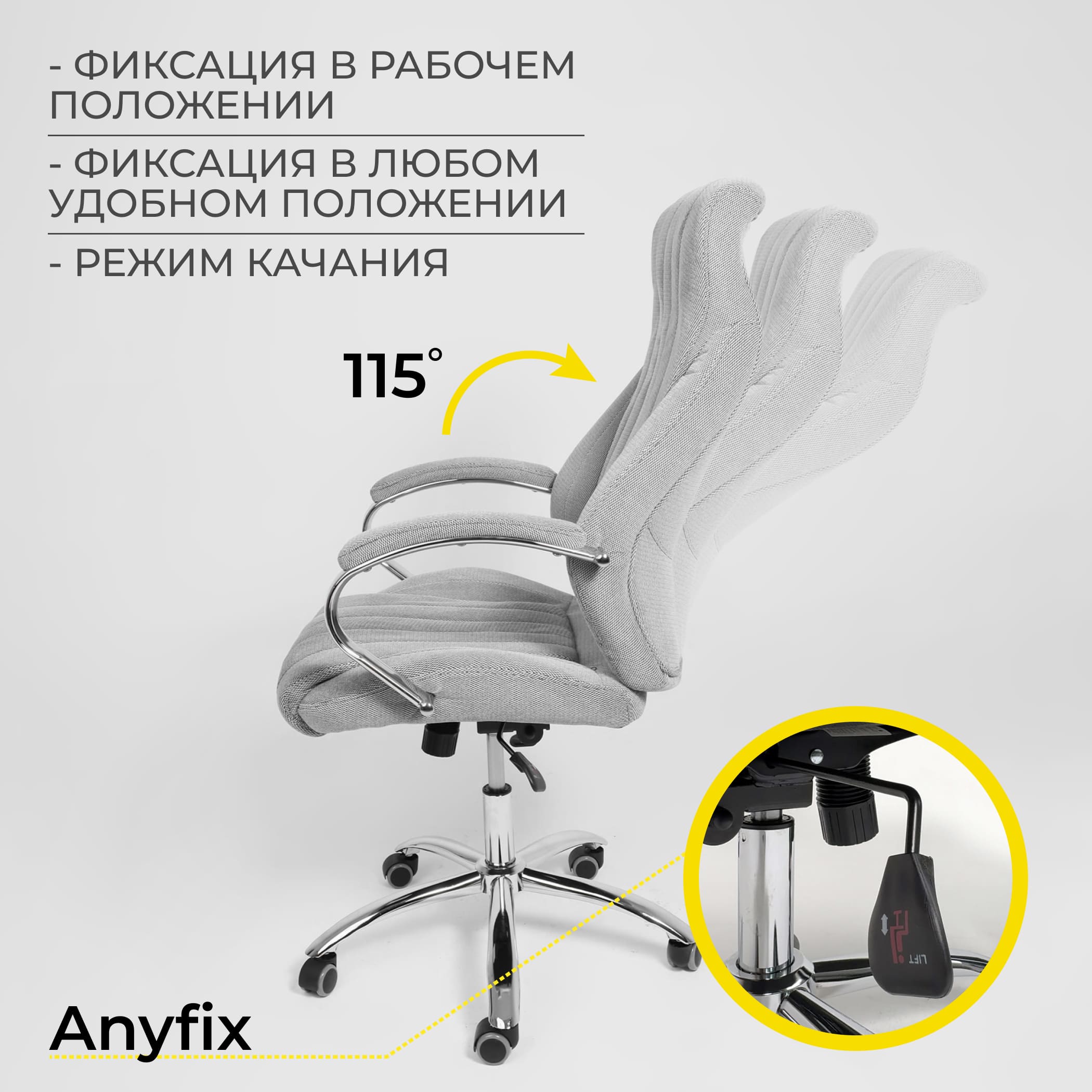 Anyfix - механизм имеет два рычага - один справа, второй слева. Один рычаг отвечает за поднятие и опускание кресла, второй рычаг - за само качание кресла. Cуперкомфортная посадка благодаря возможности принять удобный угол посадки и увеличенной амплитуде качания.