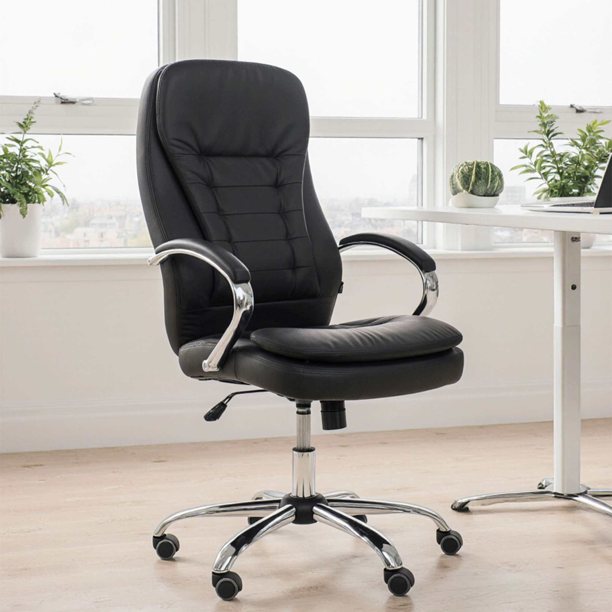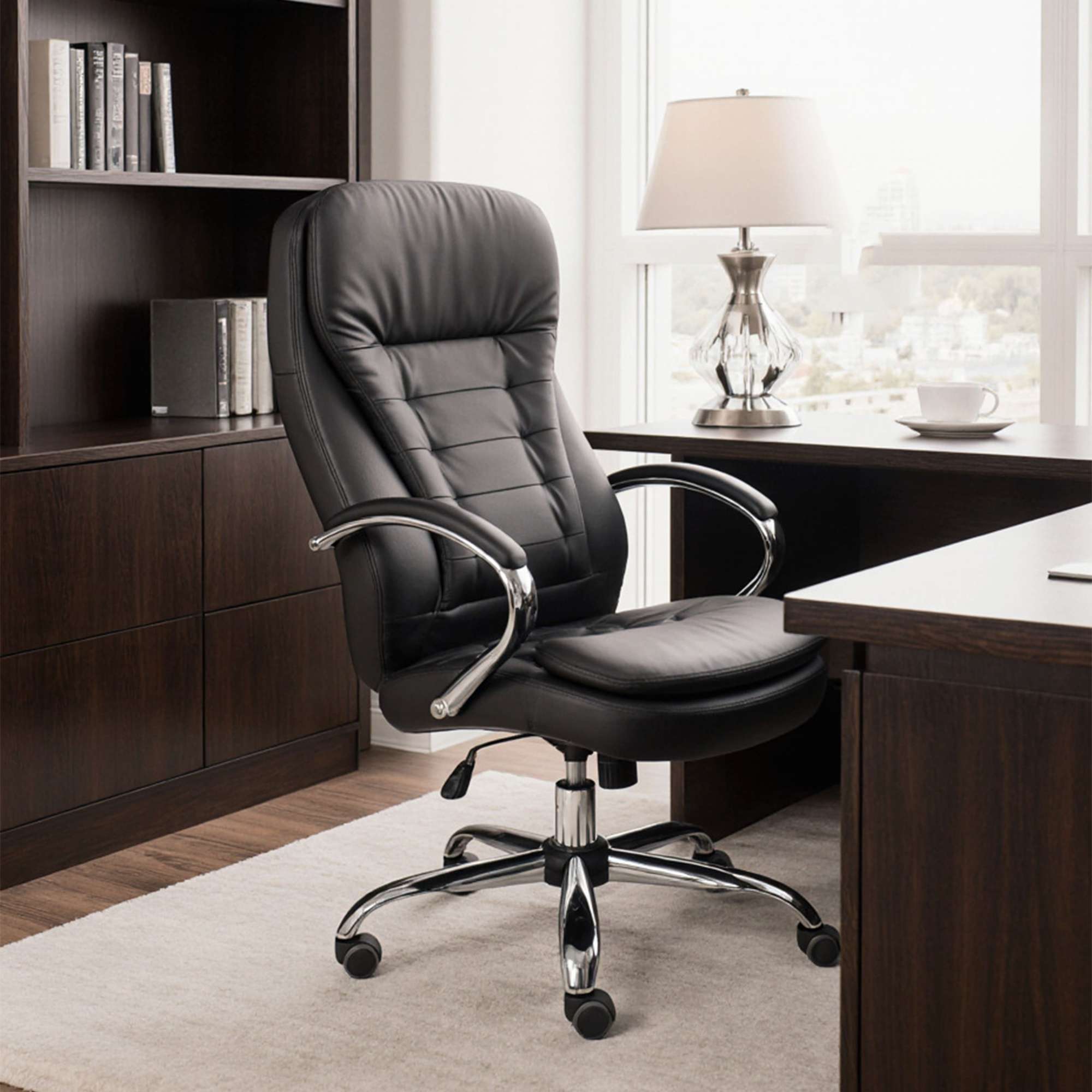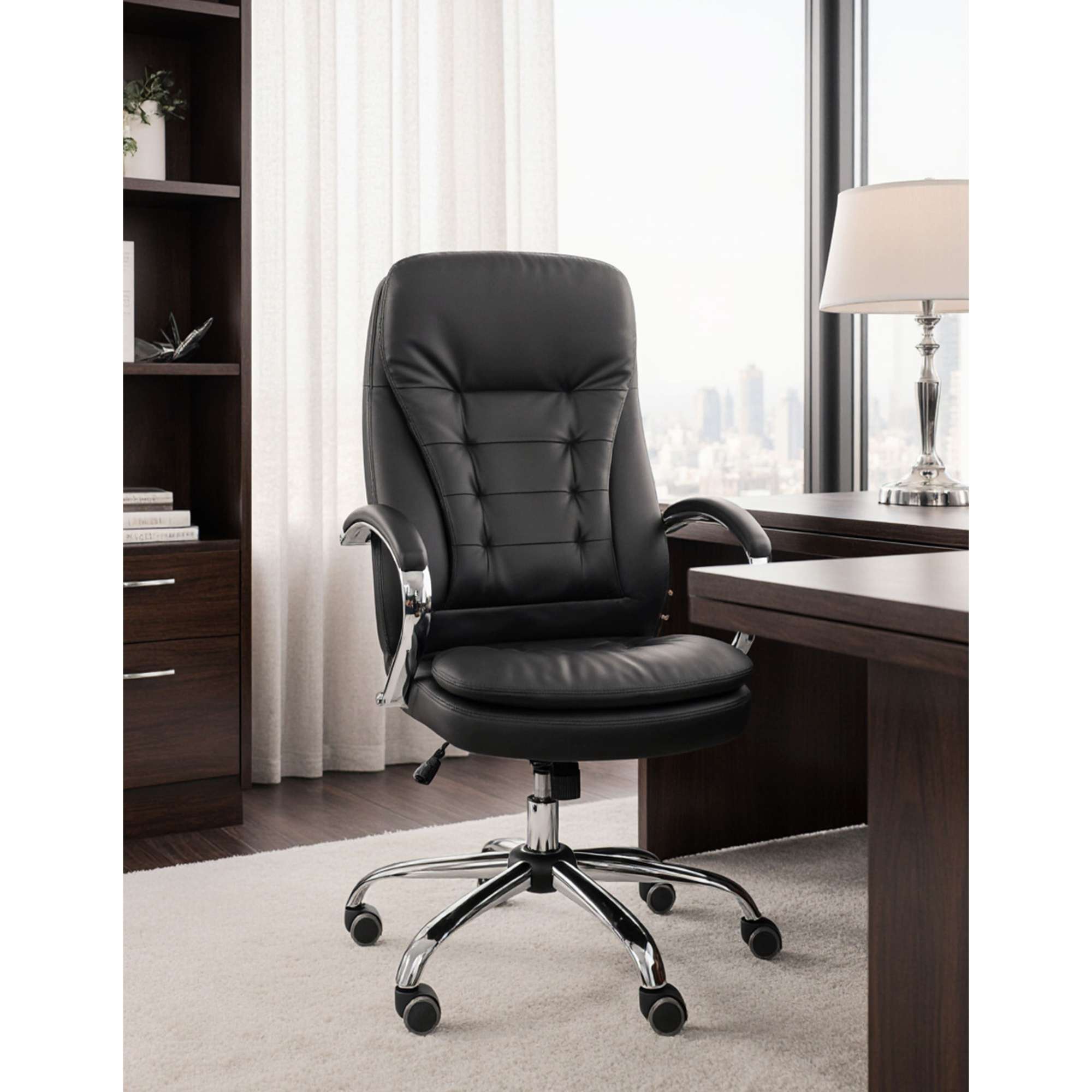 Кресло офисное RICHARD - строгость, комфорт и надежность в одном флаконе. Универсальный чёрный цвет и отделка из экокожи делают это кресло идеальным выбором как для офиса, так и для домашнего кабинета. Модель оснащена механизмом Tilt, который позволяет зафиксировать удобное положение, а также регулировать жесткость наклона - подстроится под каждого пользователя. Прорезиненные колёса не царапают пол, прочное металлическое основание с хромированным покрытием выдерживает нагрузку до 120 кг. Подлокотники, мягко обтянутые экокожей, обеспечивают дополнительный комфорт, а анатомическая спинка поддерживает спину в течение всего дня.