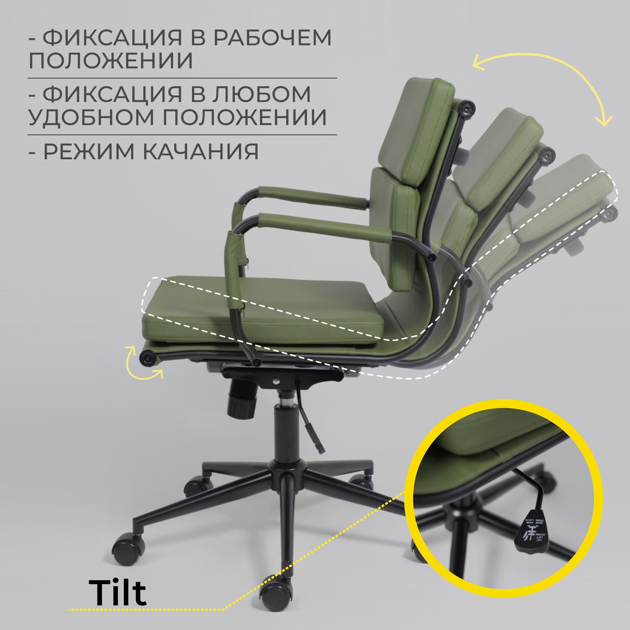 Tilt - позволяет зафиксировать положение сидящего в кресле, также есть управление жесткости наклона: мягче или жестче наклон под вес пользователя. Управление механизмом Tilt осуществляется с помощью одного рычага, расположенного в нижней части под сиденьем кресла.