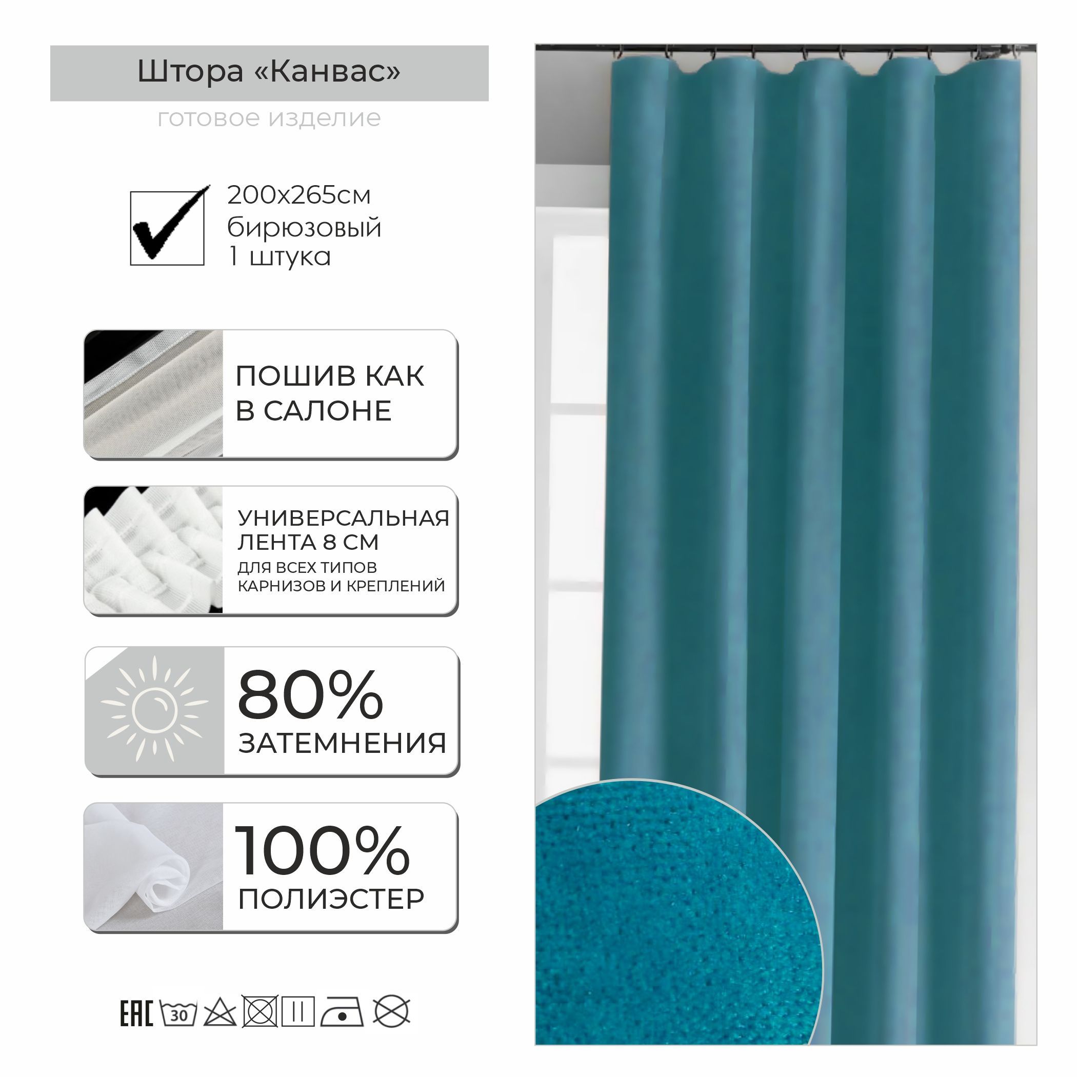 Штора КАНВАС 2*2,65м, бирюзовый