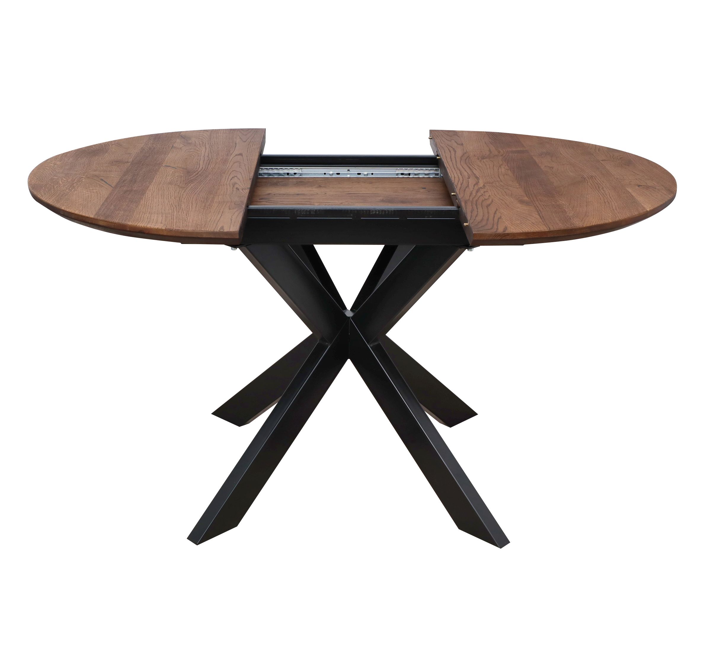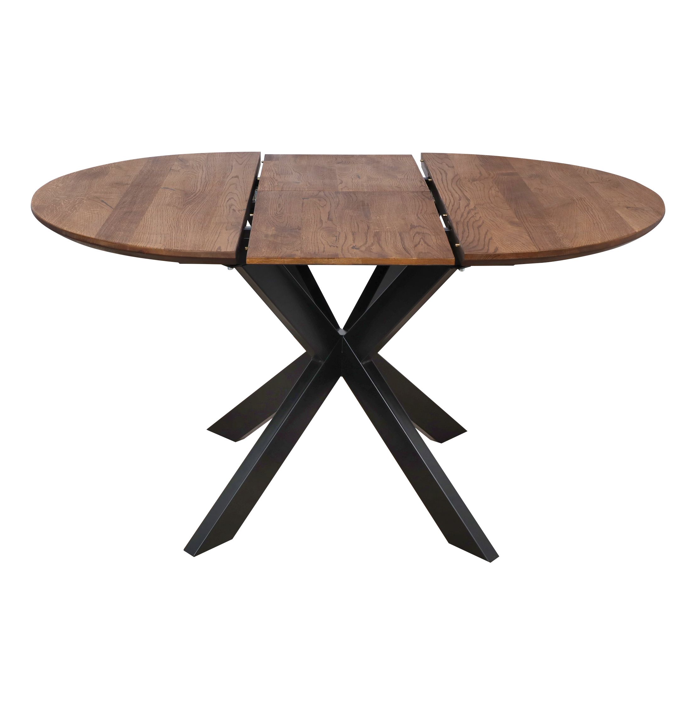 Обеденный стол РАУНД с раскладной столешницей. Круглая столешница толщиной 40 мм выполнена из инженерного массива. При необходимости длину стола можно увеличить на дополнительные 40 см.