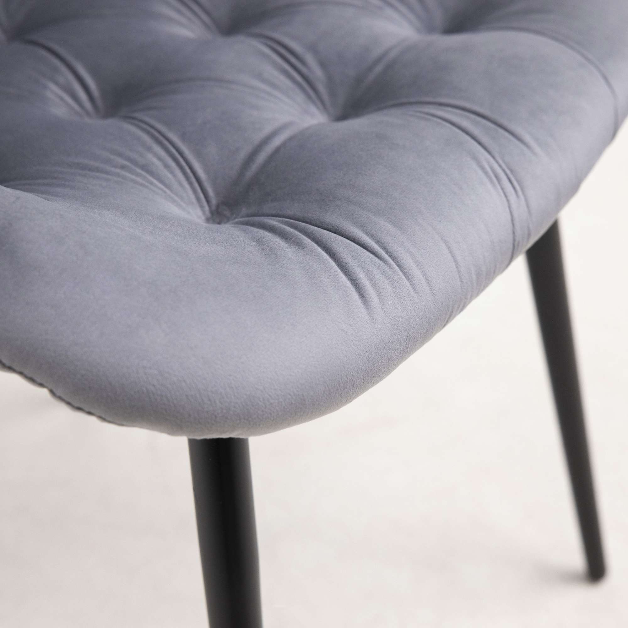 Кухонный стул в обивке из бархата без подлокотников. Внутренняя сторона спинки украшена декоративной строчкой. Лаконичный дизайн стульев подойдет к обеденному столу любого дизайна.